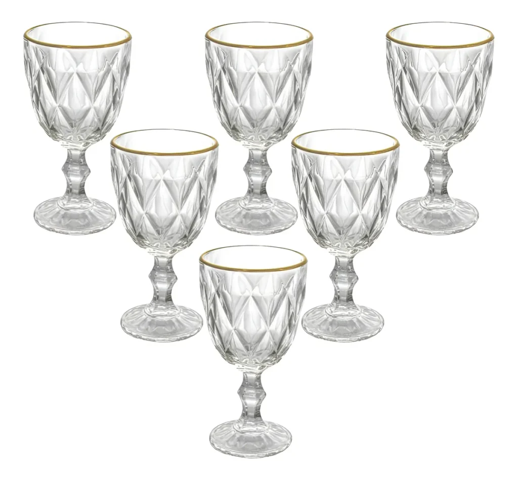 JOGO 6 TAÇAS EM VIDRO DIAMOND 330ML COM BORDA DOURADA TRANSPARENTE