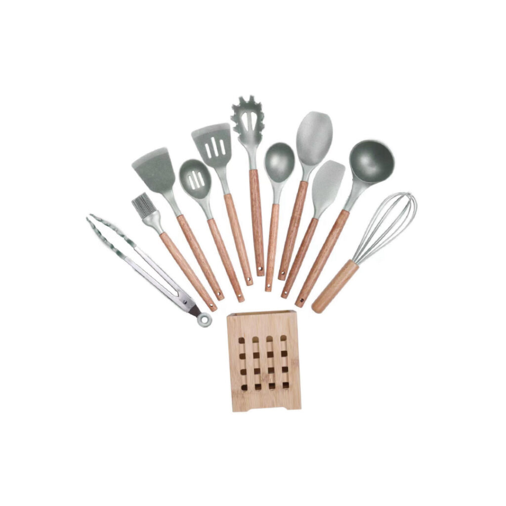 CONJUNTO UTENSÍLIOS DE COZINHA 12 PEÇAS DE SILICONE CESTO BAMBU CINZA