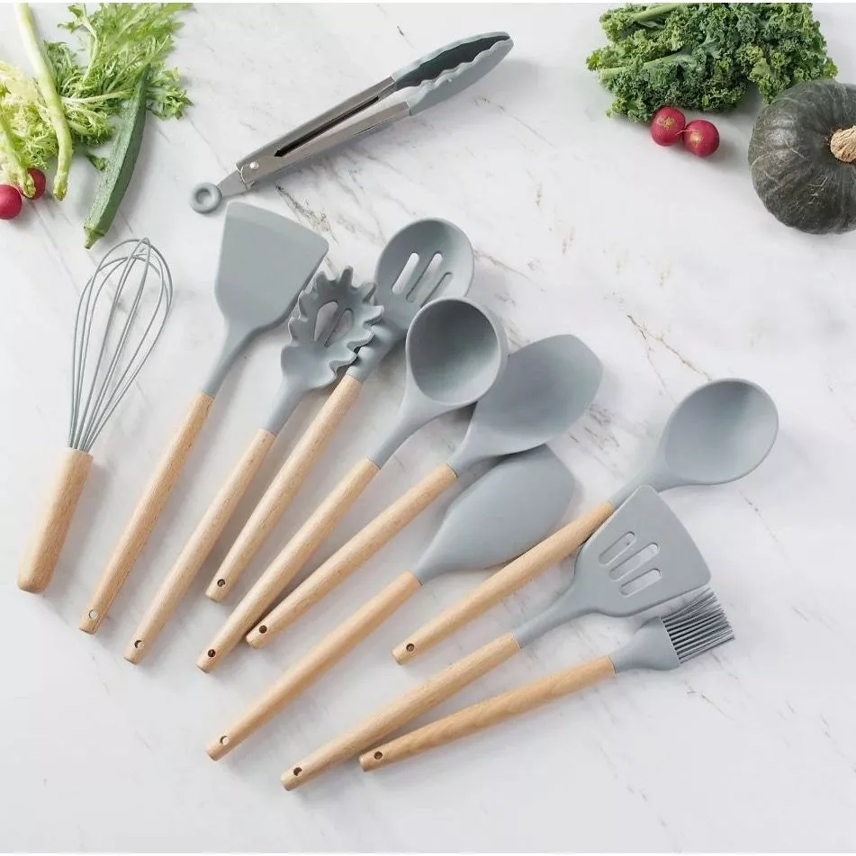 CONJUNTO UTENSÍLIOS DE COZINHA 12 PEÇAS DE SILICONE CESTO BAMBU CINZA