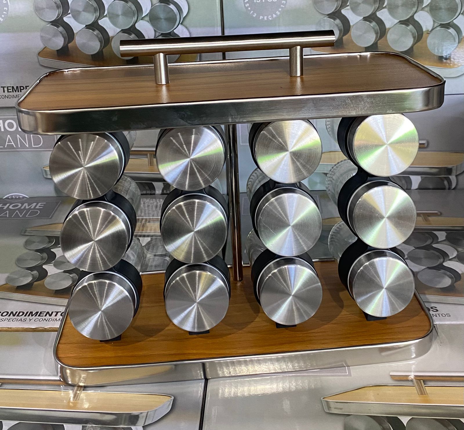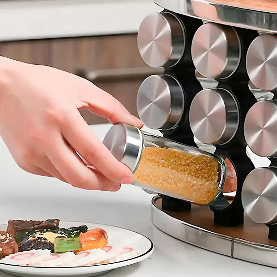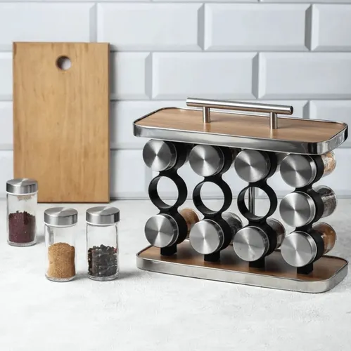 PORTA TEMPERO VERTICAL COM ALÇA E 12 POTES DE VIDRO INOX